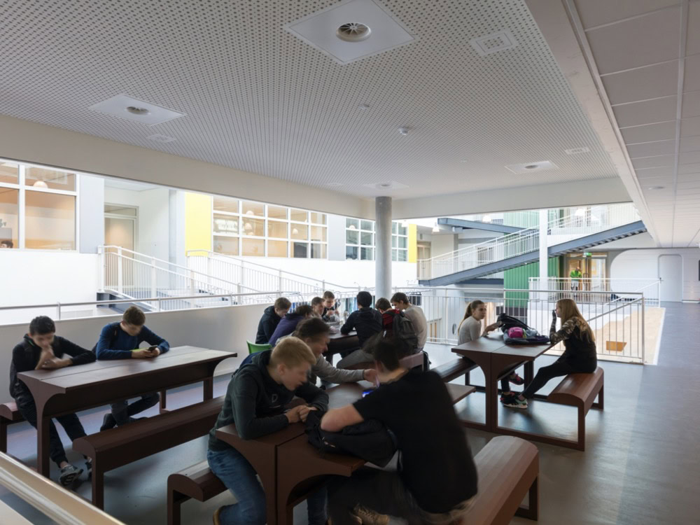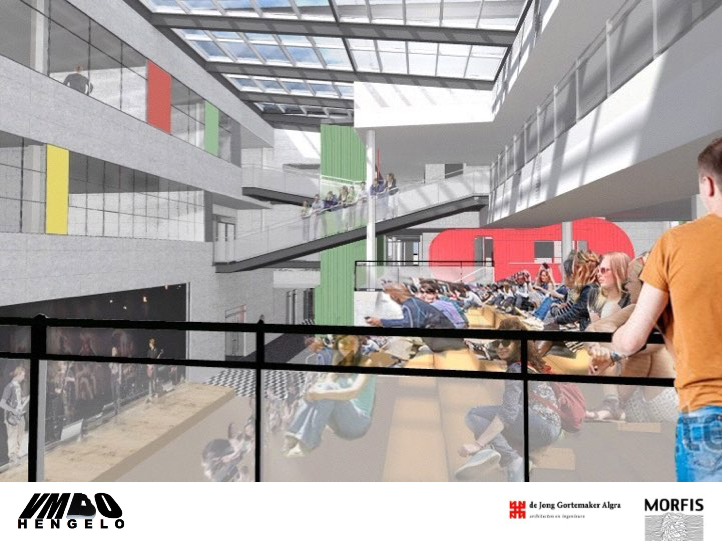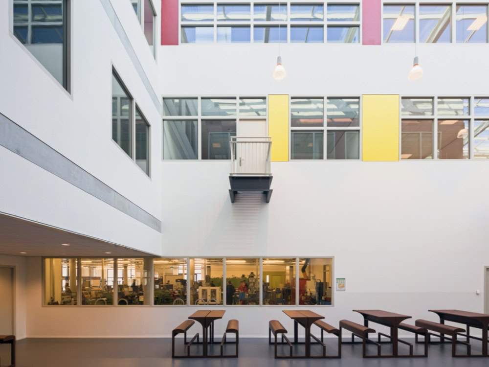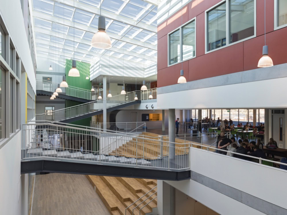 Het C.T. Stork College in Hengelo ligt op de overgang tussen de stedelijke en landschappelijke context . De zuidzijde, gericht naar de stad, is industrieel vormgegeven, verwijzend naar de historisch rijke maakindustrie van Hengelo. In contrast hiermee is golvende noordgevel een organische overgang naar het twentse landschap. Het hart van de school is het centrale atrium, waarin een monumentale tribunetrap en loopbruggen fungeren als verbindende elementen tussen de diverse onderwijsdomeinen. Deze opzet maximaliseert de visuele transparantie en creëert een hoogwaardige ruimtelijke continuïteit binnen een compact volume.