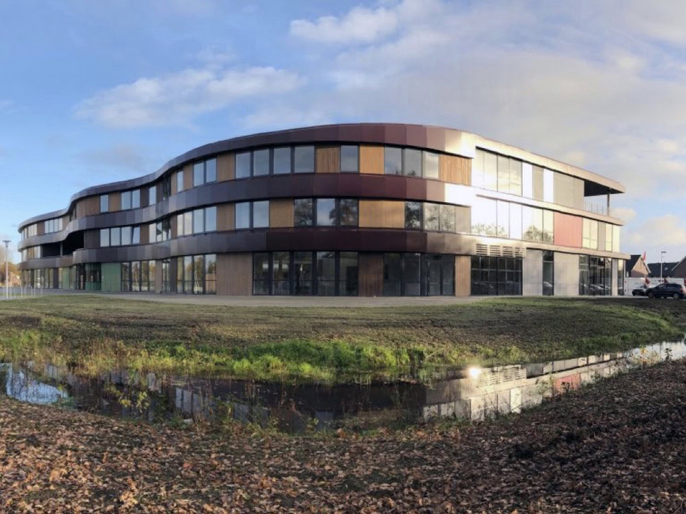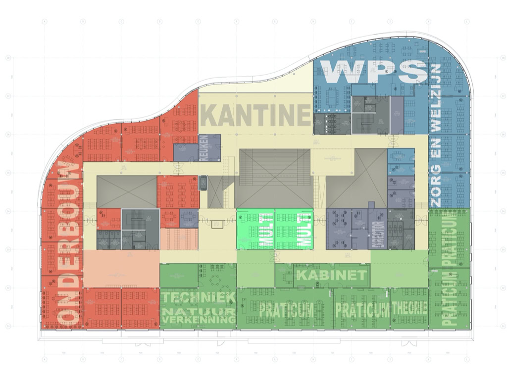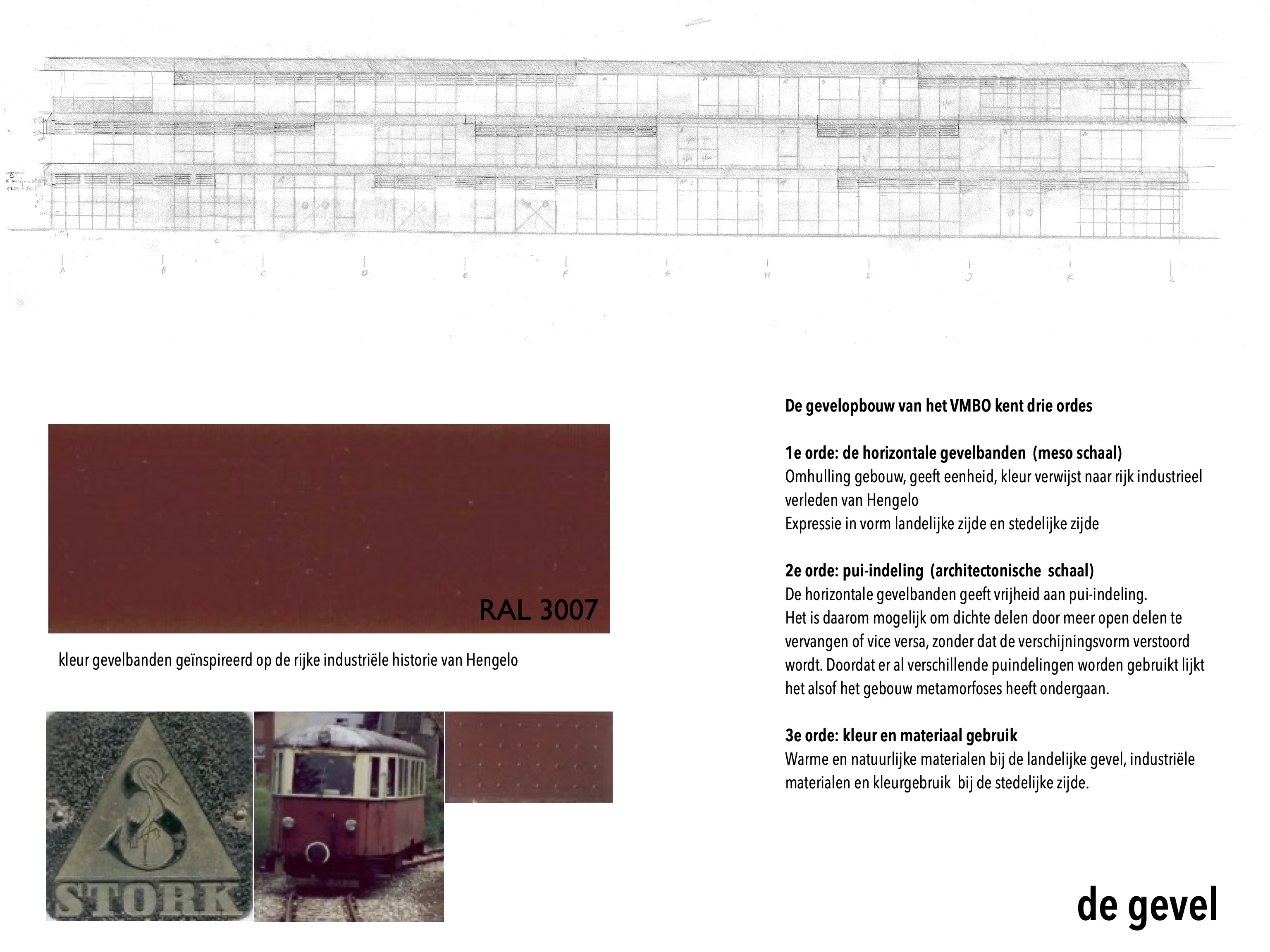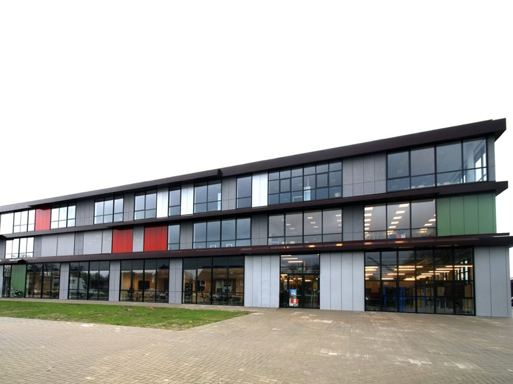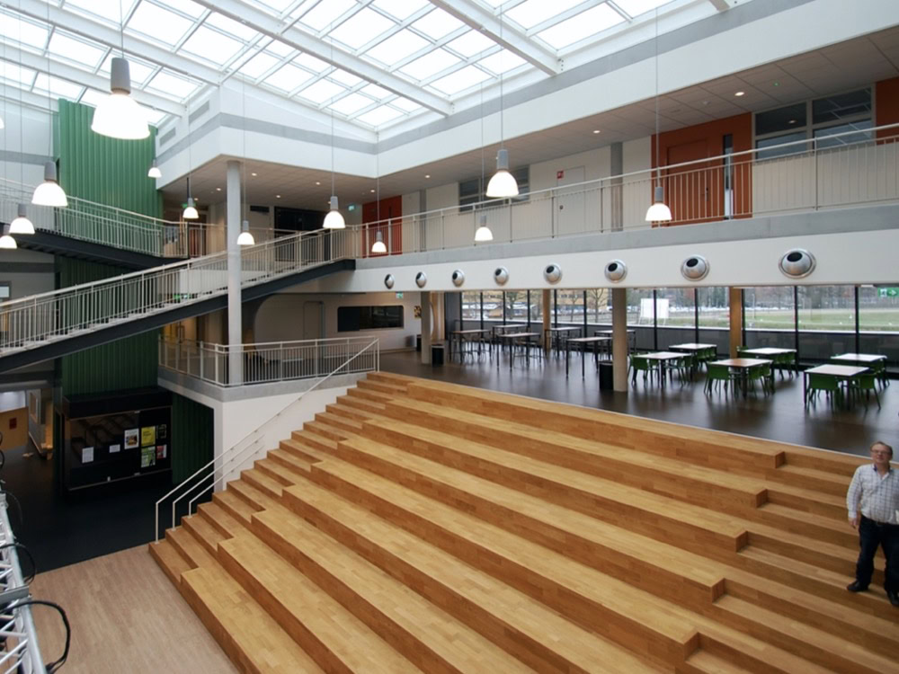 Het C.T. Stork College in Hengelo ligt op de overgang tussen de stedelijke en landschappelijke context . De zuidzijde, gericht naar de stad, is industrieel vormgegeven, verwijzend naar de historisch rijke maakindustrie van Hengelo. In contrast hiermee is golvende noordgevel een organische overgang naar het twentse landschap. Het hart van de school is het centrale atrium, waarin een monumentale tribunetrap en loopbruggen fungeren als verbindende elementen tussen de diverse onderwijsdomeinen. Deze opzet maximaliseert de visuele transparantie en creëert een hoogwaardige ruimtelijke continuïteit binnen een compact volume.
